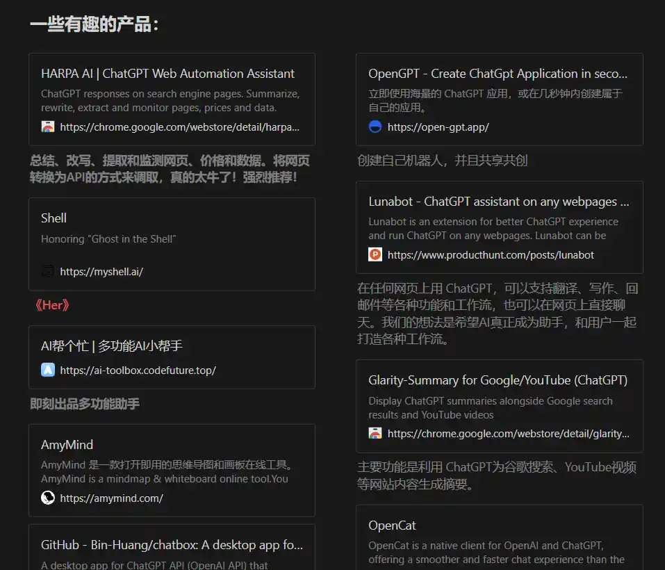 一份网友整理的Notion文档,基于 Open AI 产品的一些相关整理,主要内容分为4大块:CharGPT相关程序搭建、ChatGPT相关有趣的产品、Prompt学习相关、如何学习自己的内容库