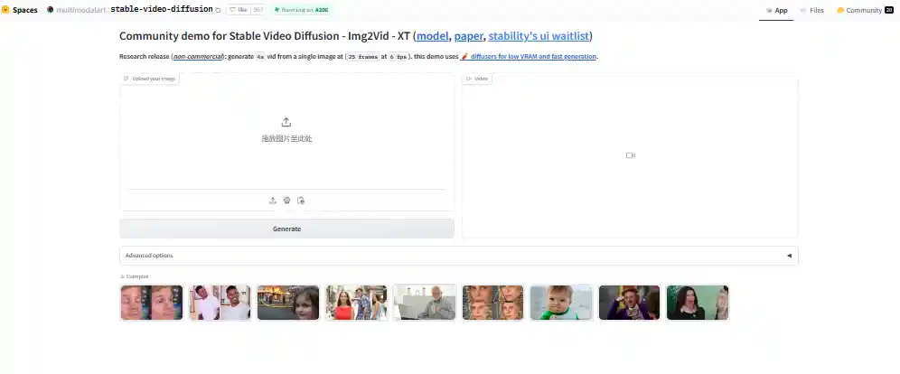 目前SVD只发布了基础模型,想要体验SVD又苦于硬件实力不够的玩家,可以上HuggingFace体验SVD的“图生视频”功能。进入界面,左边拖入图片,右边为生成的视频,点击高级选项,可选择种子(Seed)编号、控制运动幅度以及调节帧率等,设置好后,点击“Generate”即可生成视频。