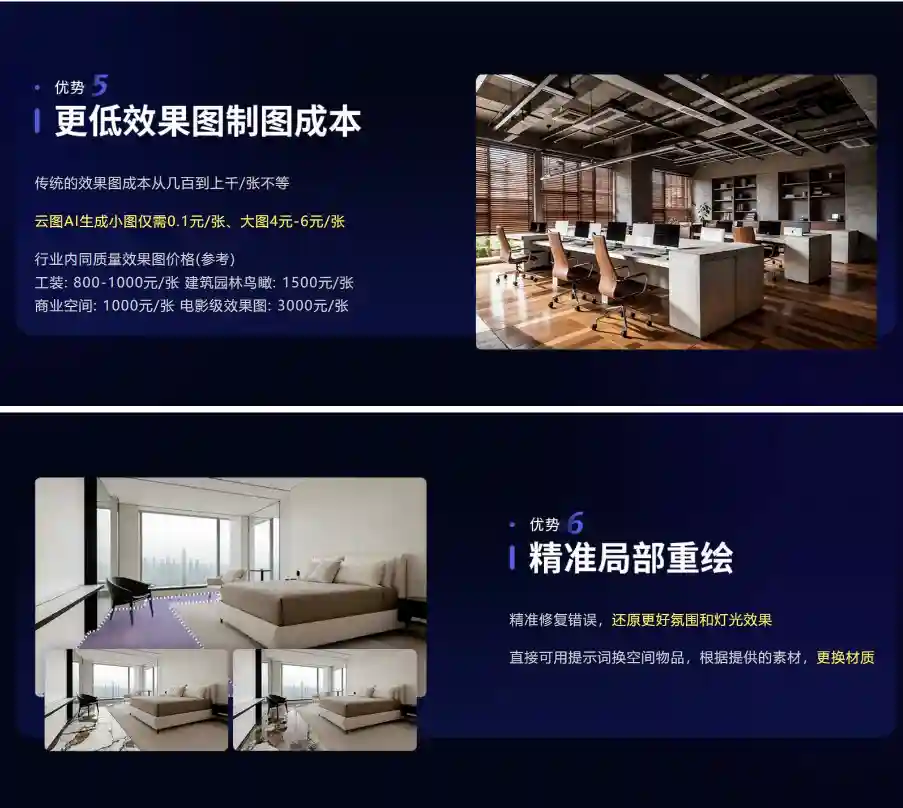 可根据上传的线稿图、实景图、白模图、彩平图等,快速生成多张设计效果图;且可实现局部修改等功能 ,助力设计师低成本快速出图,轻松锁定客户收取定金