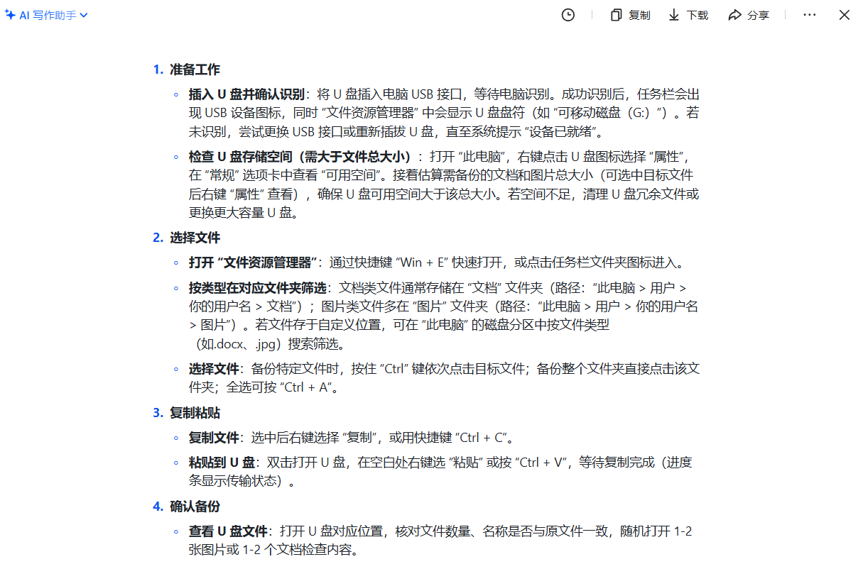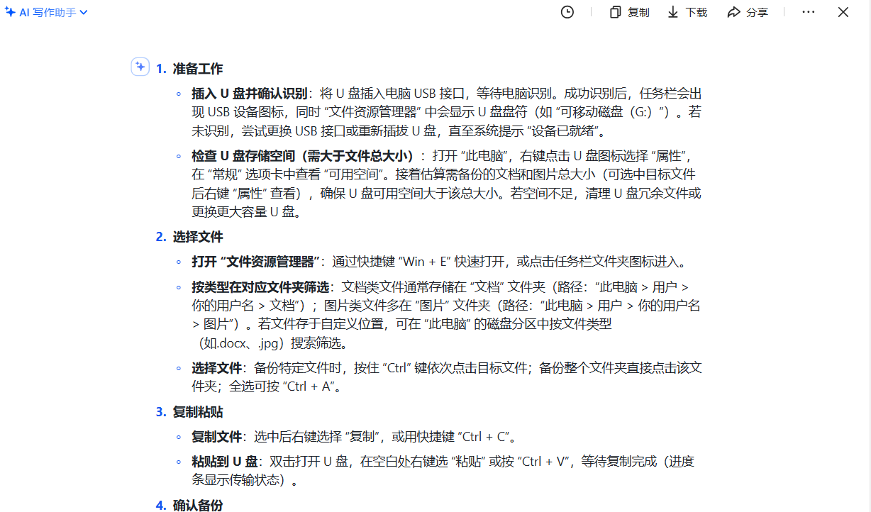 向豆包发出生成指令,如 “我要用 U 盘备份 Windows 电脑里的文档、图片,每周一次,帮我生成简易步骤。基于上述信息,生成步骤框架,按‘准备工作、选择文件、复制粘贴、确认备份’分步骤,每步说明关键操作”,用指令生成步骤的主体结构。