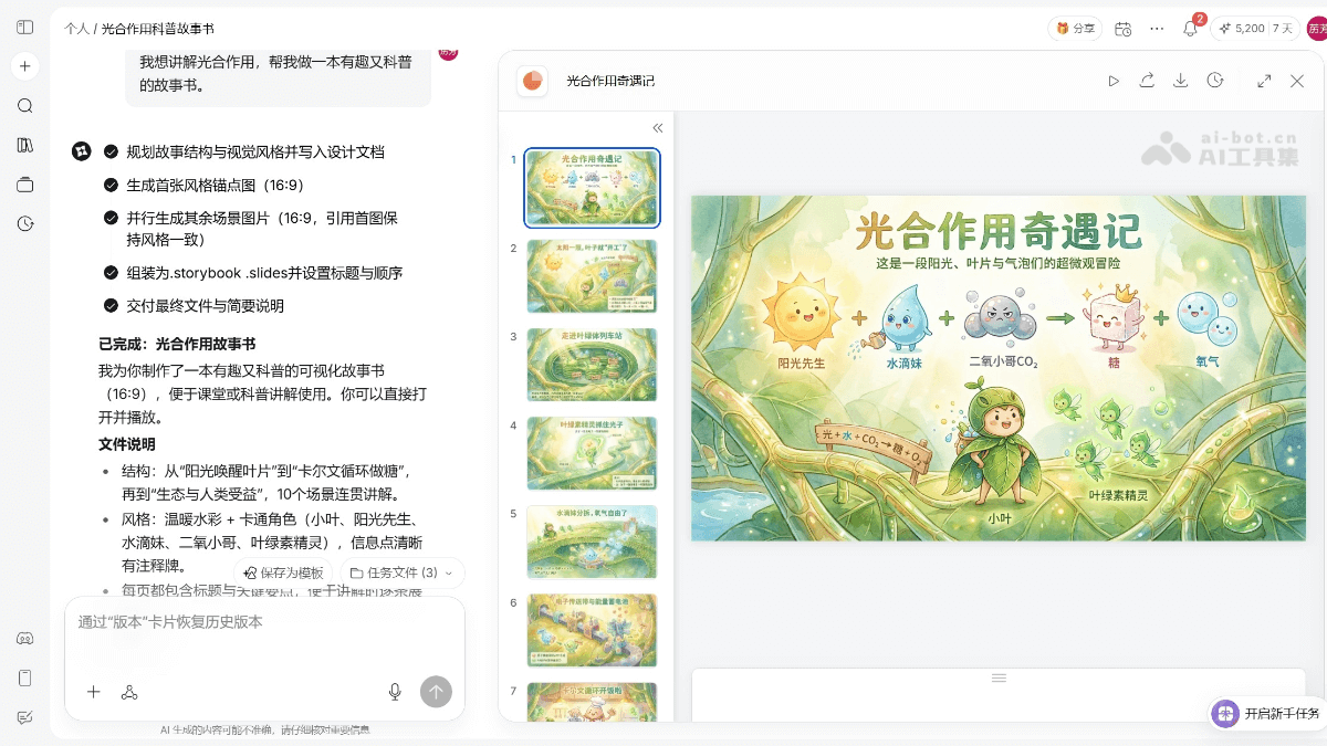 创建绘本示例:我想讲解光合作用,帮我做一本有趣又科普的故事书。