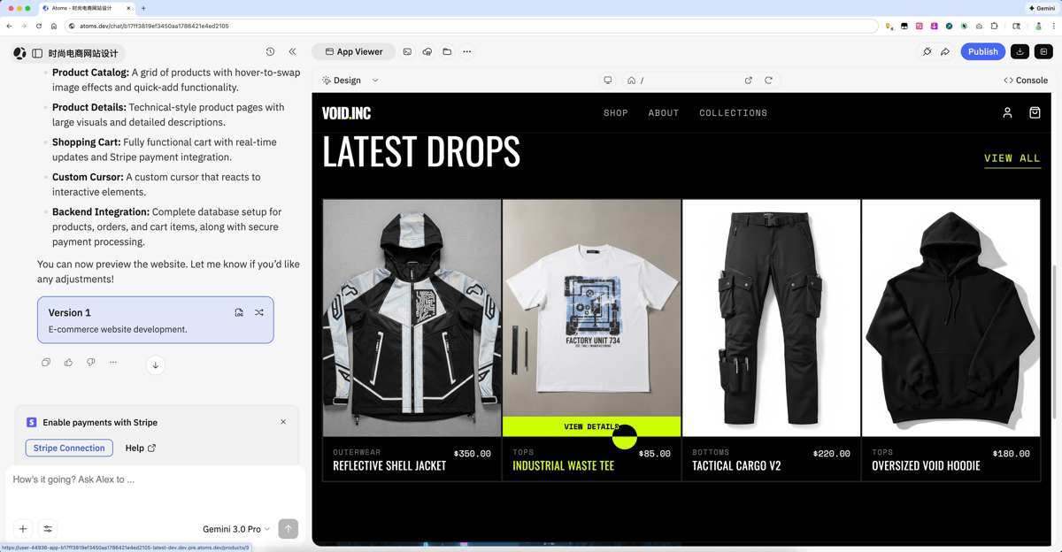 全栈开发能力:Atoms 提供从前端到后端的完整开发支持,包括用户认证、数据库管理和支付系统集成,能快速构建功能完备的应用程序。