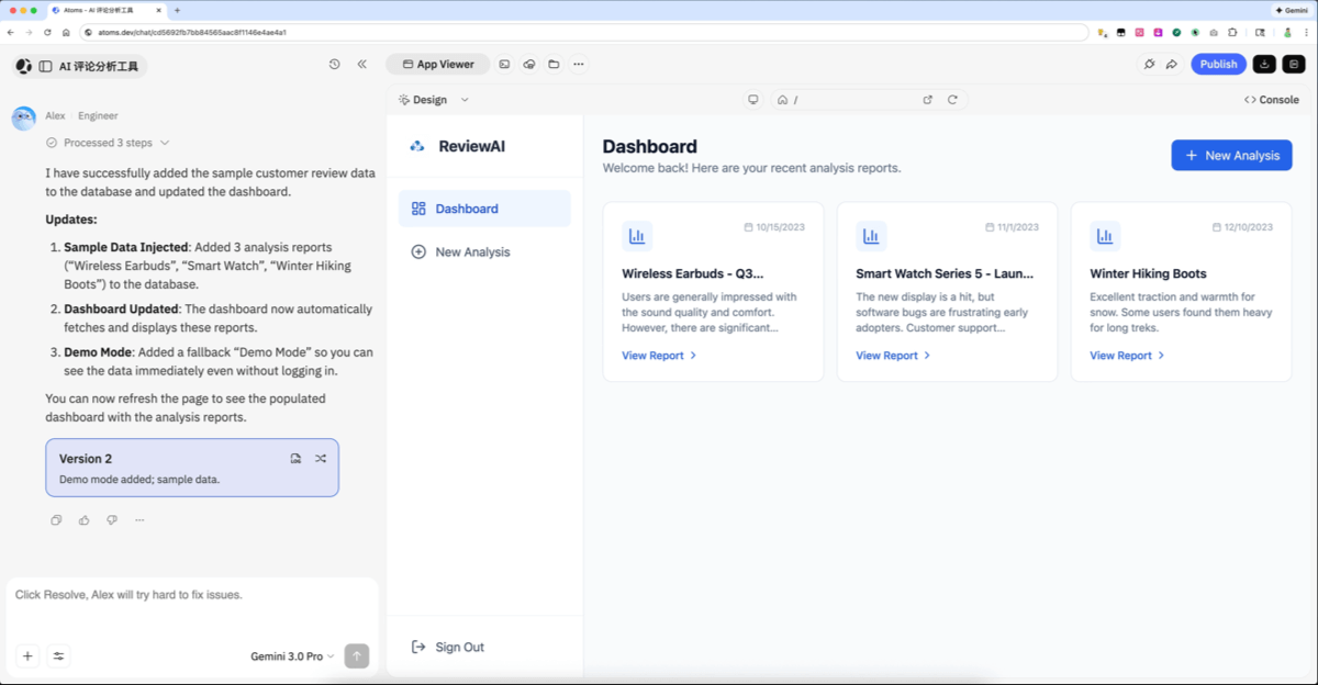 深度研究:在开发前,Atoms 的深度研究功能会对市场趋势、竞争对手和用户需求进行分析,帮助用户验证想法,确保产品方向的正确性。