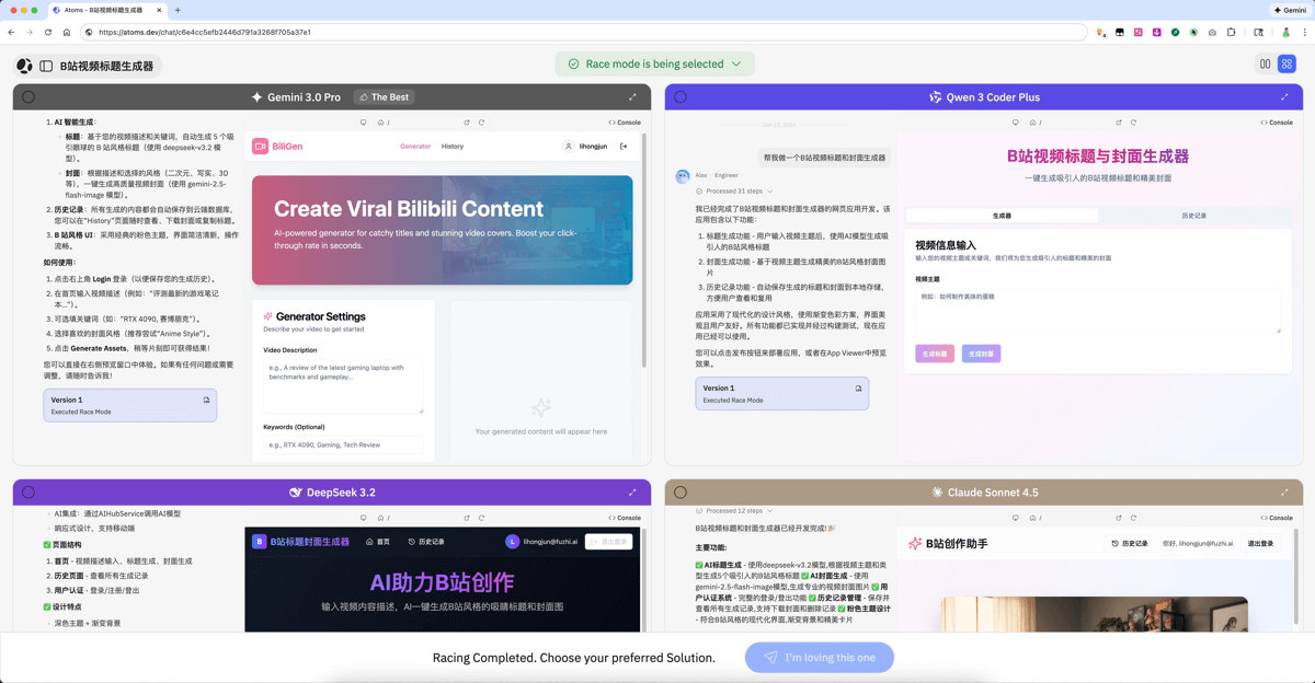 竞速模式:在聊天框工具栏中启用“竞速模式”,让多个 AI 团队并行开发,选择最优方案。